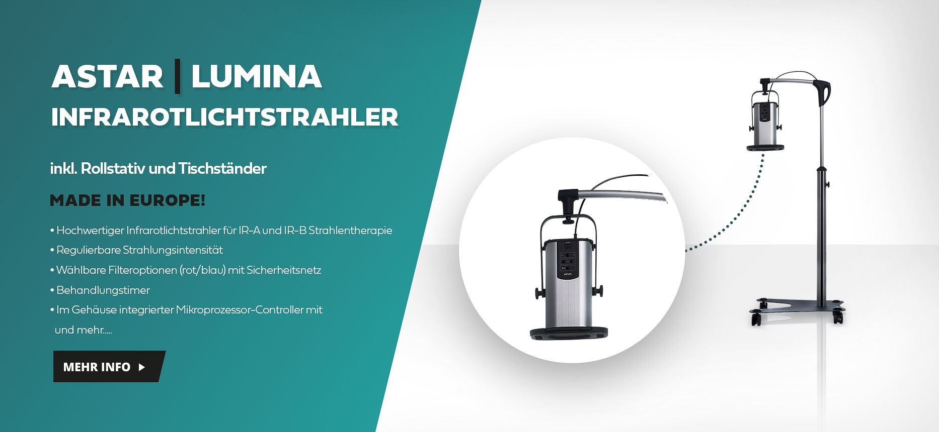 Produkteigenschaften: Hochwertiger Infrarotlichtstrahler für IR-A und IR-B Strahlentherapie Regulierbare Strahlungsintensität Wählbare Filteroptionen (rot/blau) mit Sicherheitsnetz Behandlungstimer Im Gehäuse integrierter Mikroprozessor-Controller mit Display Einfache Bedienung und Ablesbarkeit Flexible Winkelverstellung Präzise Ausrichtungsmöglichkeit Spezielle Drehelemente und Lampenhalterungen Mit Tischständer und höhenverstellbarem Rollstativ (4 Räder mit Bremsfeststellern) Zwangsrohrkühlung Technische Details: Intensität des Lampenlichts: 10 - 99 % maximale Leistung der Glühbirne: 375 W Energieverbrauch: max. 450 W Behandlungszeit: 1 - 30 Minuten Gerätehöhe (mit Stativ): min. 120 cm, max. 190 cm Maße des Lampensockels (B x T): max. 50 x 60 cm Maße Tischständer ohne Lampe (B x T x H): 30 x 31,5 x 6 cm Maße Tischständer mit Lampe (B x T x H): 30 x 39 x 41 cm Gewicht des Stativs mit Lampe: 13,7 kg Gewicht des Tischständers mit Lampe: 5,5 kg Stromversorgung, Stromverbrauch: 230 V, 50/60 Hz, 450 W Lieferumfang: 1x 375 W Strahler 1x Lampenröhre 1x Tischständer 1x mobiler Ständer 1x Netzkabel 1x Rotfilter 1x Blaufilter 1x Schutzbrille für Patient:innen 1x Schutzbrille für Therapeut:innen 1x Inbusschlüssel 2x Ersatz-Sicherungen 1x Gebrauchsanweisung 1x Elektrischer Sicherheitstestbericht