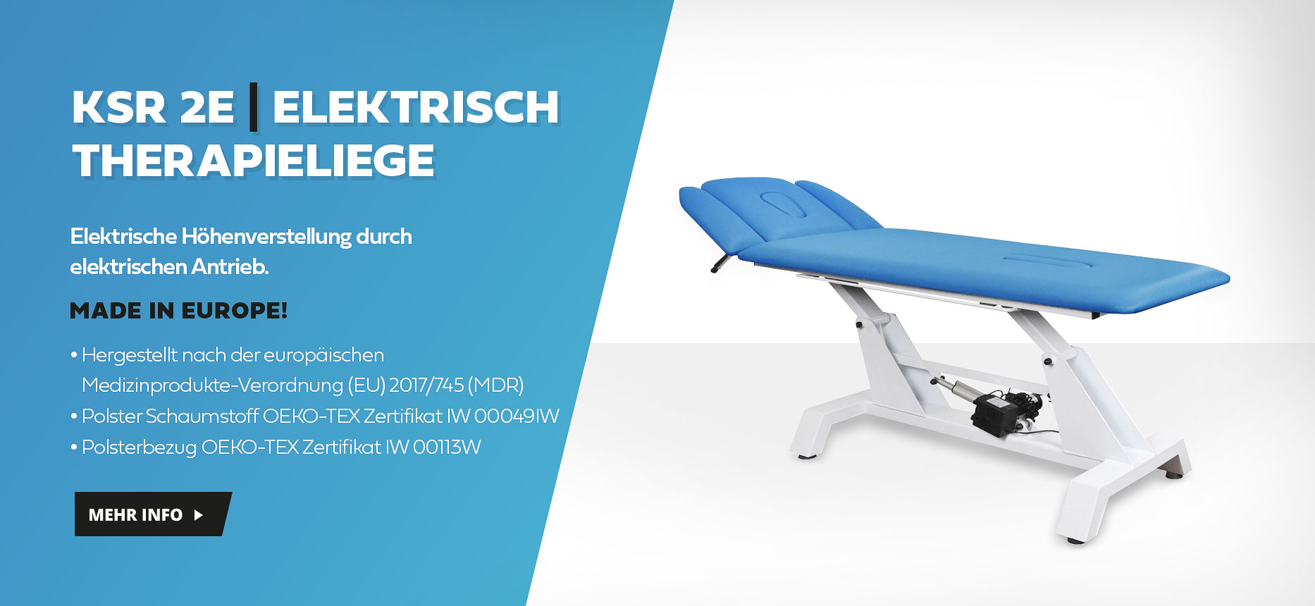 Therapieliege KSR 2 E elektrischKSR 2 E - elektrische Höhenverstellung durch elektrischen Antrieb.Made in EU – in Europa hergestelltHergestellt nach der europäischen Medizinprodukte-Verordnung (EU) 2017/745 (MDR)Polster Schaumstoff OEKO-TEX Zertifikat IW 00049IWPolsterbezug OEKO-TEX Zertifikat IW 00113WElektrische Höhenverstellung durch elektrischen Antrieb ohne absenkbaren Armteilen (Kopfteil 3-teilig)- diese Option ist ein Zubehör mit Aufpreis.Serienmäßige Ausstattung:• Zweiteilige Platte• Öffnung in der Kopfstütze und der Liegefläche (Inklusive Polstereinsatz)• Mit Gasfeder verstellbare Kopfstütze• Griffe für Stabilisierungsgurten auf beiden Seiten der Liegefläche• Kunstlederpolsterung standard line (Farben 1-25)• Rahmenfarbe weiß• 4 verstellbare Füße• Handfernsteuerung für elektrische Höhenverstellung • Inklusive SperrboxOptionales Zubehör:• Papierrollenhalterung 60 oder 70 cm• Rahmen in beliebiger Farbe nach RAL-Symbolik (außer weiß)• Laufsystem mit 4 Lenkrollen (Rädergestell)• Fuß- oder Funkfernbedienung oder Steuerrahmen in der Basis der Liege zur Höhenverstellung• Kopfteil 3-teilig Armlehnen absenkbar (die Abbildung oben zeigt bereits das 3teilige Kopfteil das gegen Aufpreis unter Zubehör bestellt werden kann) HINWEIS: DIESE OPTION IST NICHT MIT DER LIEGENBREITE 100cm KOMBINIERBAR!Technische DatenLänge 200 cmBreite 69 cmHöhe 64-87cmZulässige Belastung 150 kgGewicht 65 kgEinstellen des Winkels der Kopfstütze -80° - 50°EU-KonformitätserklärungUnser Produkt entspricht den folgenden harmonisierten Normen:EN ISO 15223-1EN 1041EN ISO 14971EN ISO 13485EN ISO 10993-1EN 62366EN 1021-1EN 1021-2EN ISO 60601-2-52EN 60601-1EN 60601-1-2Garantie:Behandlungs- und Therapieliegen Stahlrahmen 2 jahre Elektrische / hydraulische Komponenten 1 jahr Polster 1 jahrWir verwenden elektrische, hydraulische Teile sowie Polster von renommierten EU-Unternehmen. Für alle unsere Produkte verwenden wir Teile, die den medizinischen EU-Normen entsprechen.Im Garantiefall übernehmen wir gerne die Abwicklung für Sie! Durch die Garantie werden die gesetzlichen Rechte aus der Gewährleistung nicht eingeschränkt.Wir haben unsere Produkte auf Langlebigkeit ausgelegt. Deshalb verwenden wir in unseren Tabellen einen modularen Aufbau. Die meisten beweglichen Teile in unseren Tabellen sind nur mit 2 Schrauben (Gasfedern, Hydraulikpumpe, lineare elektrische Stellantriebe) befestigt. Der Austausch von Teilen ist einfach und dauert bis zu 20 Minuten.Wenn sich das Produkt innerhalb der Garantiezeit befindet, senden wir Ihnen neue Komponenten kostenlos zu. Wenn Probleme mit der Reparatur auftreten, übernehmen wir die Kosten des Spezialisten, der zum Austausch / zur Reparatur von Teilen kommt. Dies gilt innerhlab der oben angegebenen Garantiezeit.Wenn das Produkt bzw der Fehler außerhalb der Garantiezeit liegt, senden wir Ihnen eine neue Komponente gegen eine Gebühr zu. Wenn bei der Reparatur Probleme auftreten, können unsere Mitarbeiter Ihnen telefonisch helfen und Anweisungen zur Durchführung der Reparatur geben.Wir möchten, dass sich alle unsere Kunden beim Kauf und bei der Verwendung unserer Produkte sicher fühlen. Deshalb verwenden wir nur zertifizierte Komponenten von europäischen Lieferanten.